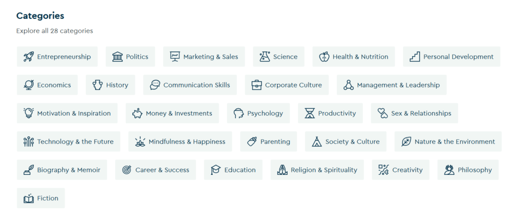 - Blinkist offers a broad selection of topics, encompassing personal development, entrepreneurship, health, and sociology, among others. Their ever growing collection of summaries currently sit at over 7,500 titles.