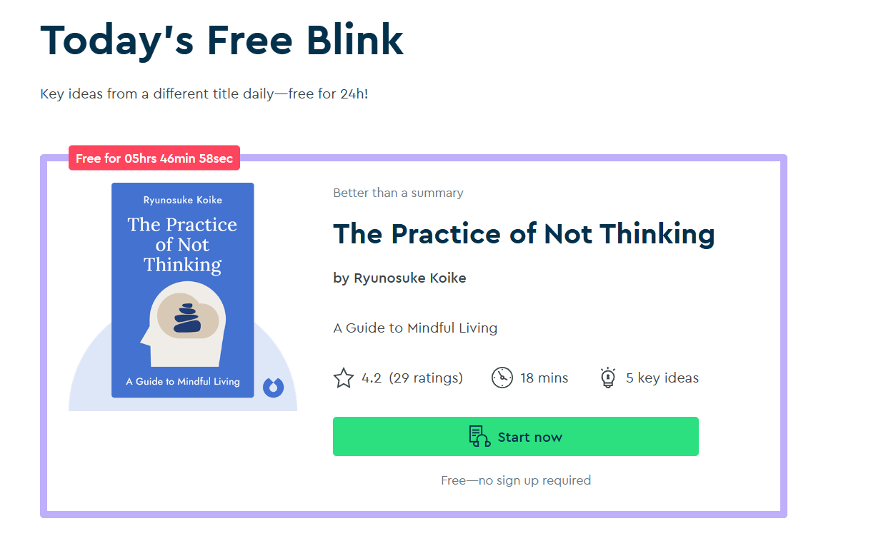 - Blinkist features a “Free Blink of the Day” – a free summary that changes everyday. This daily recommendation has introduced new books and topics that I have not previously considered before, making for rather interesting reads. I will admit not every daily blink piqued my interest, but overall I can’t complain about a daily free summary.