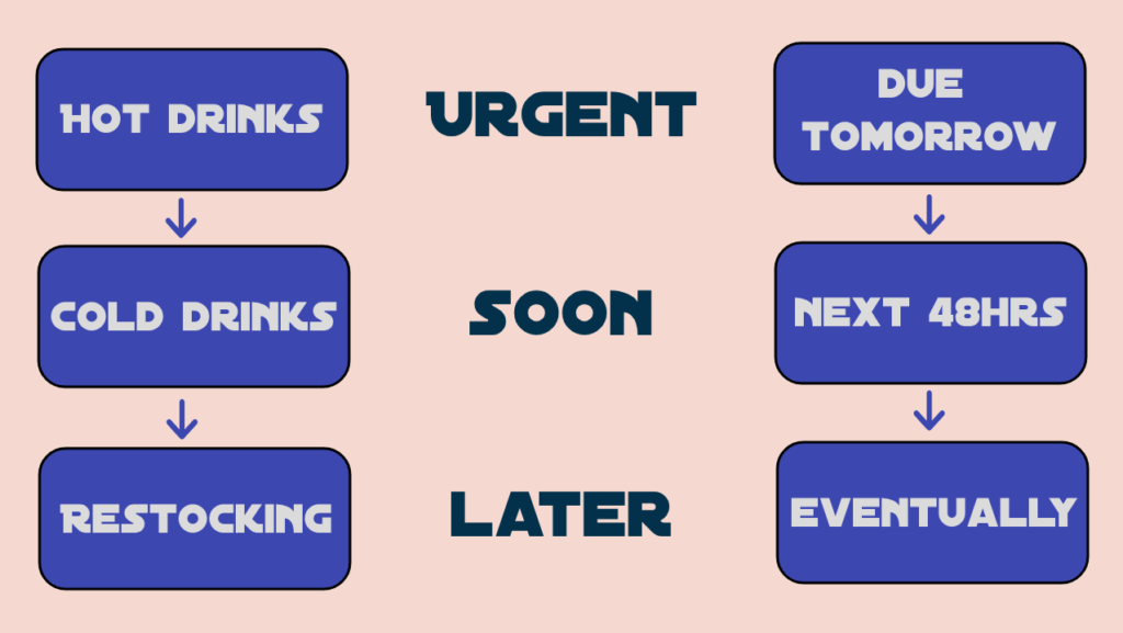 Whether it’s a mountain of assignments from university or the sudden pile of orders coming during peak hours, things can get hectic real fast. That is why I always keep to a priority system I learned from working.